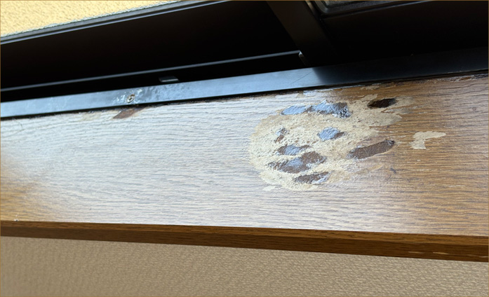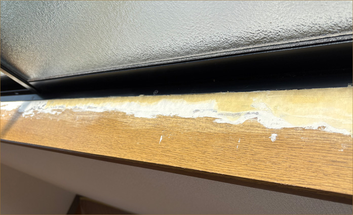 2026.1.14 傷んでいた窓枠を修繕しました 窓枠が老朽化したので、修復作業を行いました。 修復前がこちら。窓枠の材質が剥がれてしまっています。 傷んでいた箇所を、下記のように補修パテで丁寧に埋めてからシートを貼ります。 このようなご依頼も、有美堂にぜひご相談下さい。